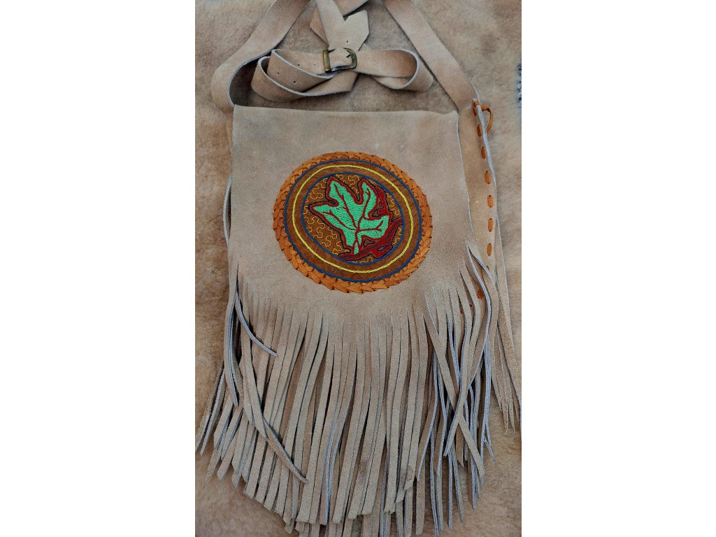 Kožená kabela, komplet ručne šitá, strihaná, zdobená. Veľmi pevná hovädzia koža. Dve priehradky. Nastaviteľný popruh. Nosenie na pleci alebo crossbody. Ručná výšivka indiánov Shipibo v Peru. Rozmer 27x25 cm.
