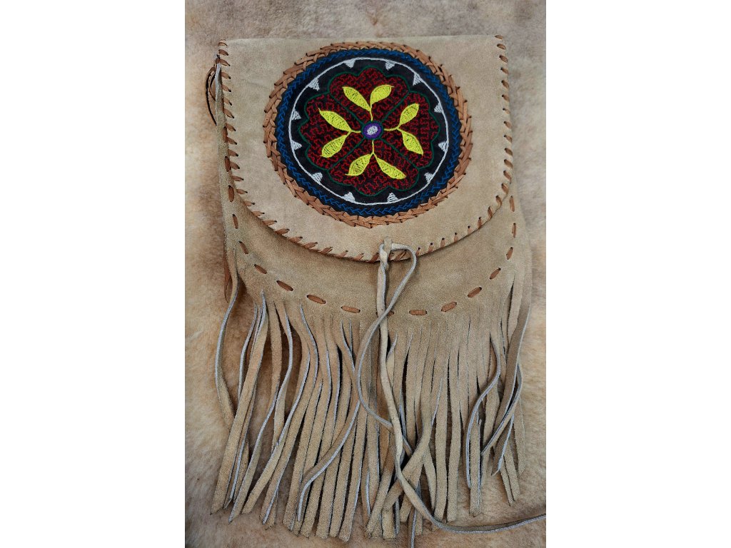 Kožená kabela, komplet ručne šitá, strihaná, zdobená, vyšívaná. Veľmi pevná hovädzia koža. Dve priehradky. Nastaviteľný popruh. Nosenie na pleci alebo crossbody. Ručná výšivka indiánov z kmeňa Shipibo. Rozmer 29x30 cm.