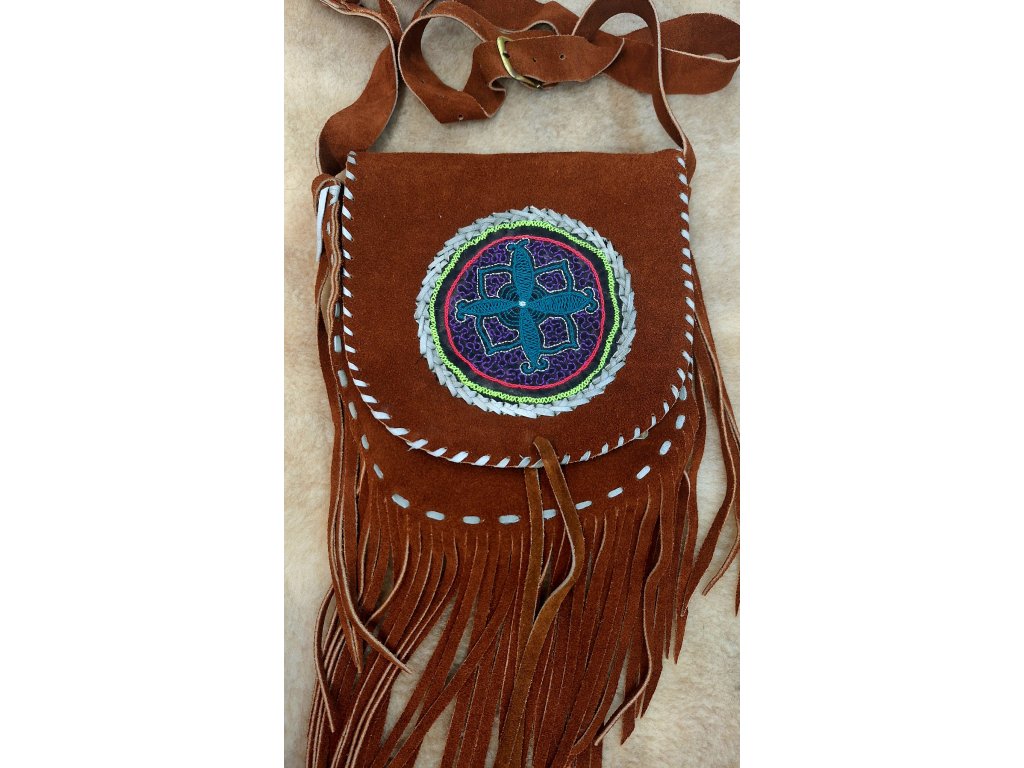Kožená kabela, komplet ručne šitá, strihaná, zdobená. Veľmi pevná hovädzia koža. Dve priehradky. Nastaviteľný popruh. Nosenie na pleci alebo crossbody. Ručná výšivka indiánov Shipibo v Peru. Rozmer 27x25 cm.
