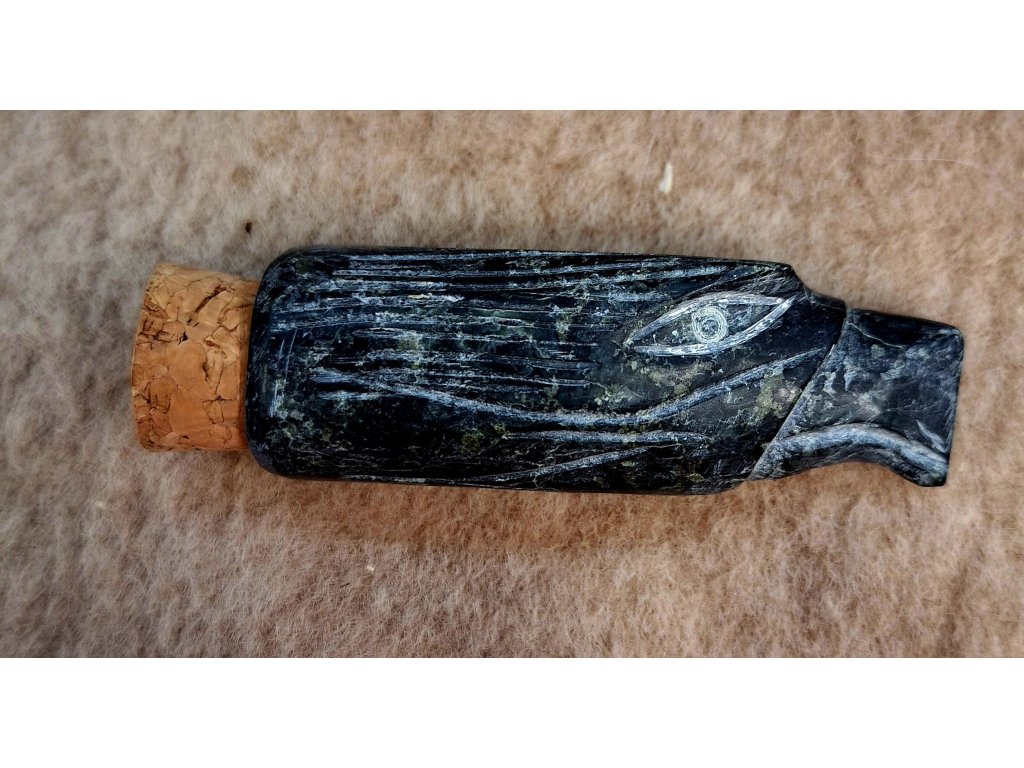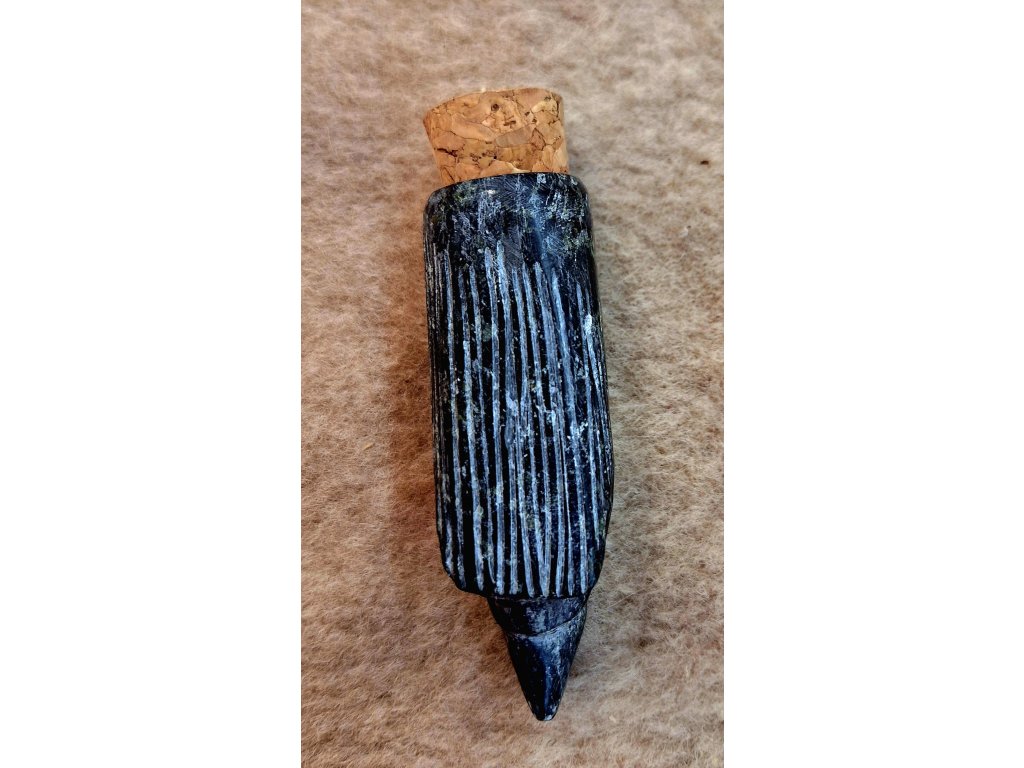 Nádobka na uloženie rapé, ručne vyrezávaná zo serpentínu. S korkovou zátkou. Rozmery cca 8x3 cm bez korku.