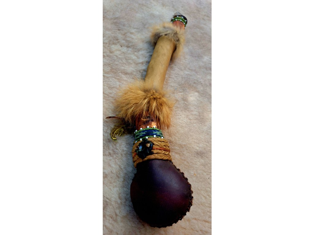 Šamanská maraca je tradičný perkusný nástroj v mnohých starých kultúrach. Naše maracy sú ručne šité zo surovej kozej kože so semienkami alebo malými sklenenými korálkami vo vnútri, ktoré sa odrážajú od vnútornej steny maracy pri rytmickom trasení a vytvárajú tak liečivé vybrácie alebo zvuky. Zdobená je zapletanou kožou, kožušinou,krištálom a chacanov-andským krížom. Priemer maracy je cca 6 cm a celková dĺžka vrátane kryštálu je cca 43 cm.