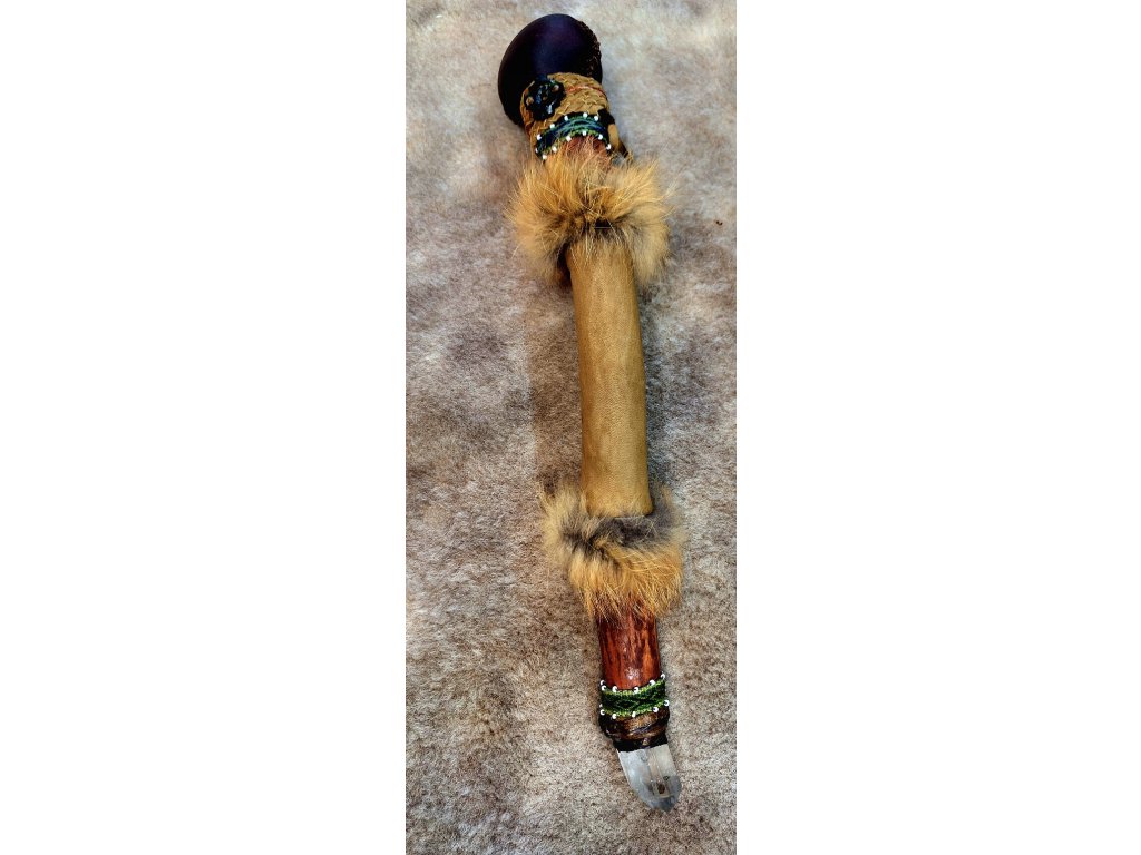 Šamanská maraca je tradičný perkusný nástroj v mnohých starých kultúrach. Naše maracy sú ručne šité zo surovej kozej kože so semienkami alebo malými sklenenými korálkami vo vnútri, ktoré sa odrážajú od vnútornej steny maracy pri rytmickom trasení a vytvárajú tak liečivé vybrácie alebo zvuky. Táto marac je osadená na borovicovom dreve s veľkým krištálom.