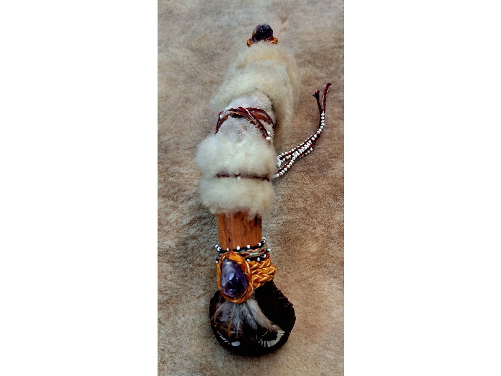 Šamanská maraca je tradičný perkusný nástroj v mnohých starých kultúrach. Naše maracy sú ručne šité zo surovej kozej kože so semienkami alebo malými sklenenými korálkami vo vnútri, ktoré sa odrážajú od vnútornej steny maracy pri rytmickom trasení a vytvárajú tak liečivé vybrácie alebo zvuky. Zdobená je pierkami, zapletanou kožou, kožušinou,krištálom a ametystom. Priemer maracy je cca 6 cm a celková dĺžka vrátane kryštálu je cca 34 cm.