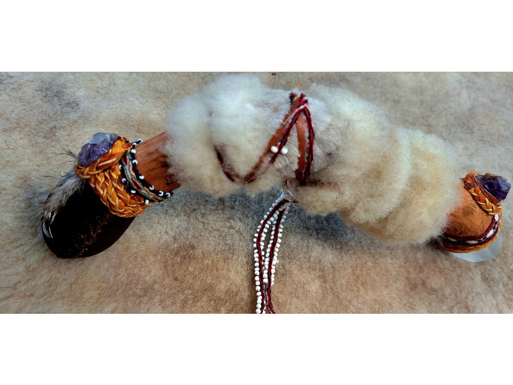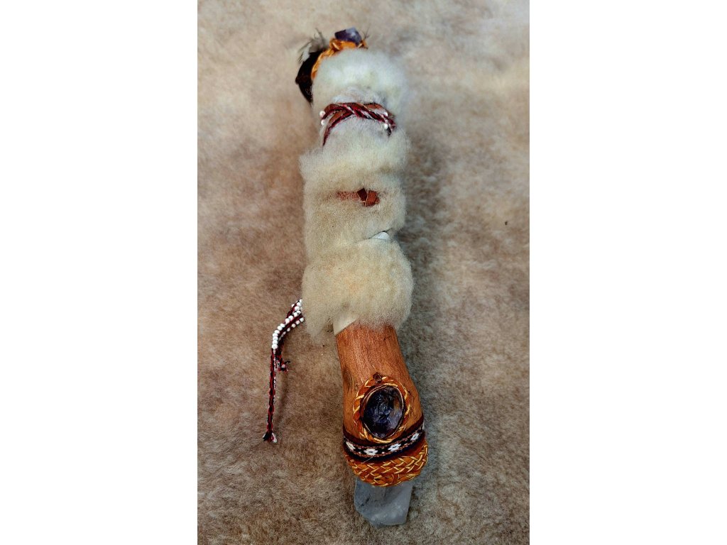 Šamanská maraca je tradičný perkusný nástroj v mnohých starých kultúrach. Naše maracy sú ručne šité zo surovej kozej kože so semienkami alebo malými sklenenými korálkami vo vnútri, ktoré sa odrážajú od vnútornej steny maracy pri rytmickom trasení a vytvárajú tak liečivé vybrácie alebo zvuky. Táto marac je osadená na borovicovom dreve s veľkým krištálom.