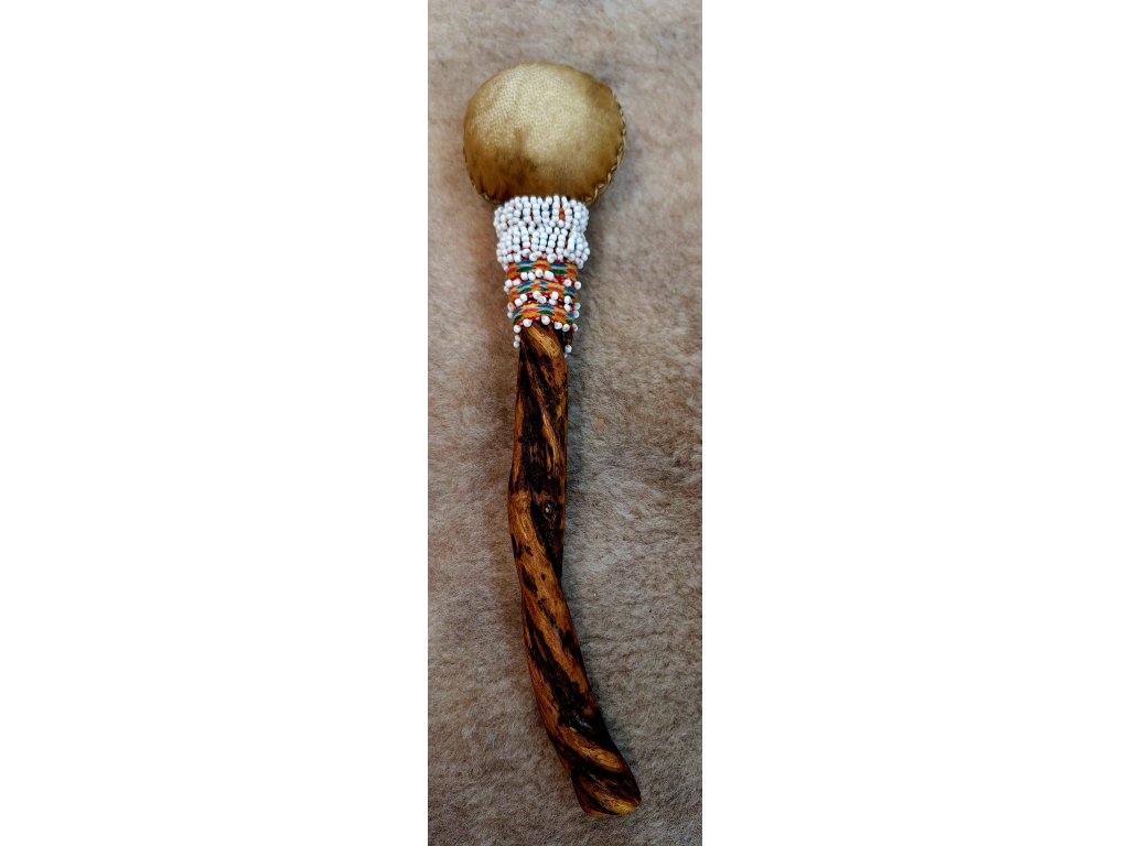 Šamanská maraca je tradičný perkusný nástroj v mnohých starých kultúrach. Naše maracy sú ručne šité zo surovej kozej kože so semienkami alebo malými sklenenými korálkami vo vnútri, ktoré sa odrážajú od vnútornej steny maracy pri rytmickom trasení a vytvárajú tak liečivé vybrácie a zvuky. Maraca je ručne zdobená. Držiak je z liany Banisteriopsis caapi. Priemer maracy je cca 7 cm a celková dĺžka je cca 29 cm.