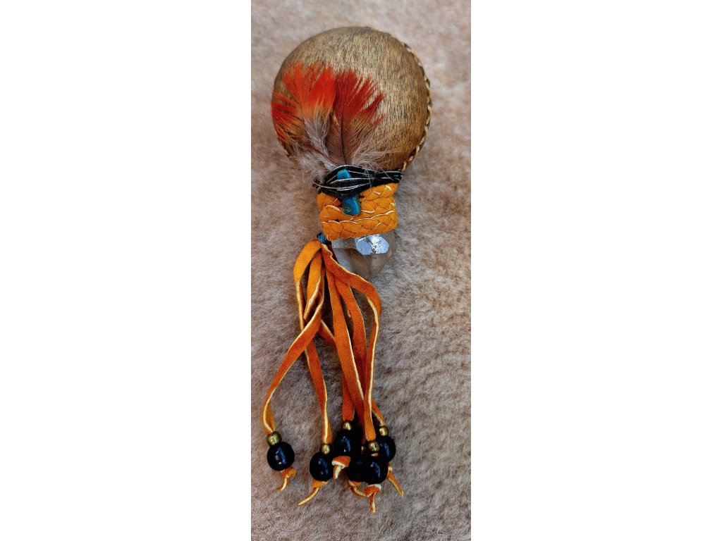 Šamanská maraca je tradičný perkusný nástroj v mnohých starých kultúrach. Naše maracy sú ručne šité zo surovej kozej kože so semienkami alebo malými sklenenými korálkami vo vnútri, ktoré sa odrážajú od vnútornej steny maracy pri rytmickom trasení a vytvárajú tak liečivé vybrácie a zvuky. Maraca je ručne zdobená, kamene sú krištál a chryzocol. Priemer maracy je cca 6 cm a celková dĺžka je cca 10,5 cm.