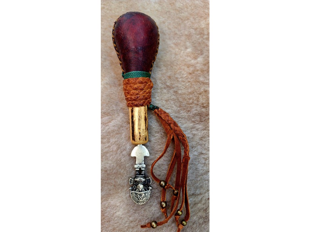 Šamanská maraca je tradičný perkusný nástroj v mnohých starých kultúrach. Naše maracy sú ručne šité zo surovej kozej kože so semienkami alebo malými sklenenými korálkami vo vnútri, ktoré sa odrážajú od vnútornej steny maracy pri rytmickom trasení a vytvárajú tak liečivé vybrácie alebo zvuky. Ručne zdobená, symbol je rituálny Incký nôž. Priemer maracy je cca 4 cm a celková dĺžka 12 cm.