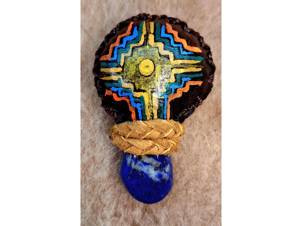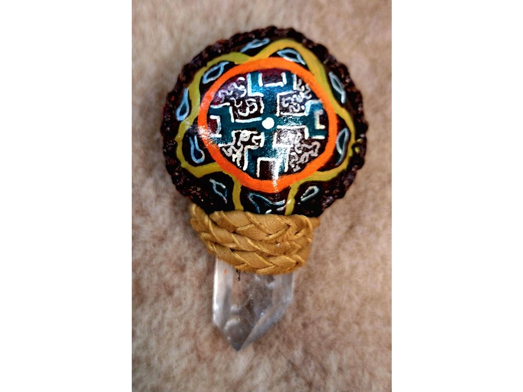 Šamanská maraca je tradičný perkusný nástroj v mnohých starých kultúrach. Naše maracy sú ručne šité zo surovej kozej kože so semienkami alebo malými sklenenými korálkami vo vnútri, ktoré sa odrážajú od vnútornej steny maracy pri rytmickom trasení a vytvárajú tak liečivé vybrácie alebo zvuky. Ručne maľovaná. Priemer maracy cca 4 x6,5cm.