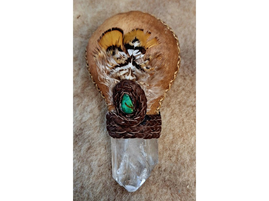 Šamanská maraca je tradičný perkusný nástroj v mnohých starých kultúrach. Naše maracy sú ručne šité zo surovej kozej kože so semienkami alebo malými sklenenými korálkami vo vnútri, ktoré sa odrážajú od vnútornej steny maracy pri rytmickom trasení a vytvárajú tak liečivé vybrácie alebo zvuky. Zdobená je zapletanou kožou, pierkami, kamene sú krištál a chryzocoll. Priemer maracy je cca 7,5cm a dĺžka vrátane krištálu je cca 13 cm.