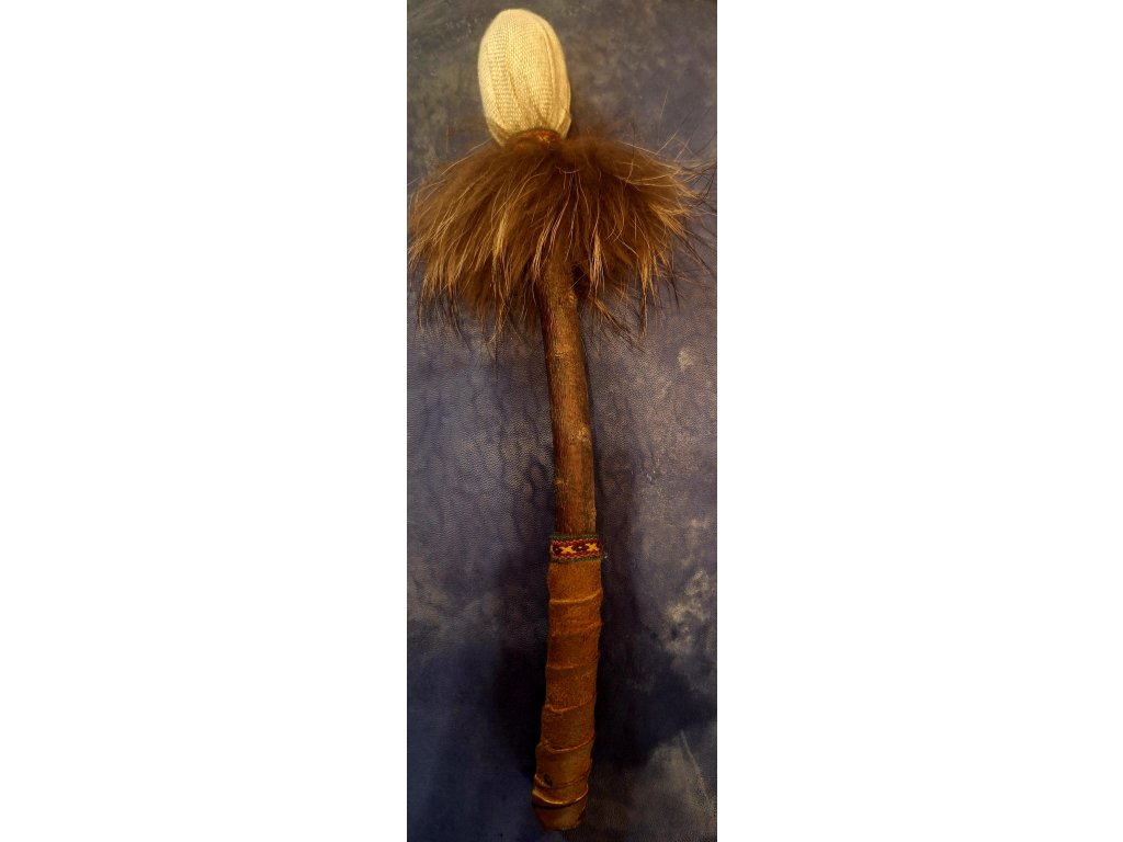 Ručne vyrobená, ručne zdobená šamanská palička k bubnu. Dĺžka 38 cm. Materiál drevo, koža, kožušina, ľan.