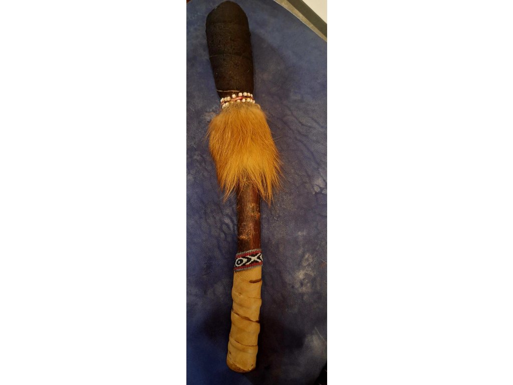 Ručne vyrobená, zdobená a vyšívaná šamanská palička k bubnu. Dĺžka 34 cm.