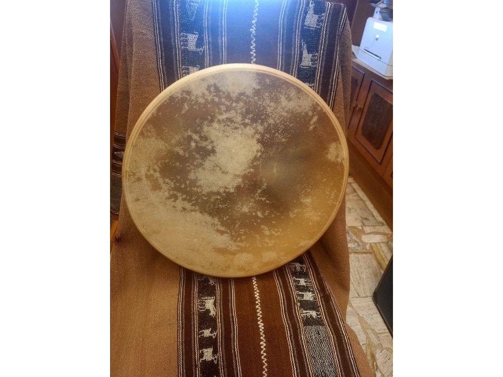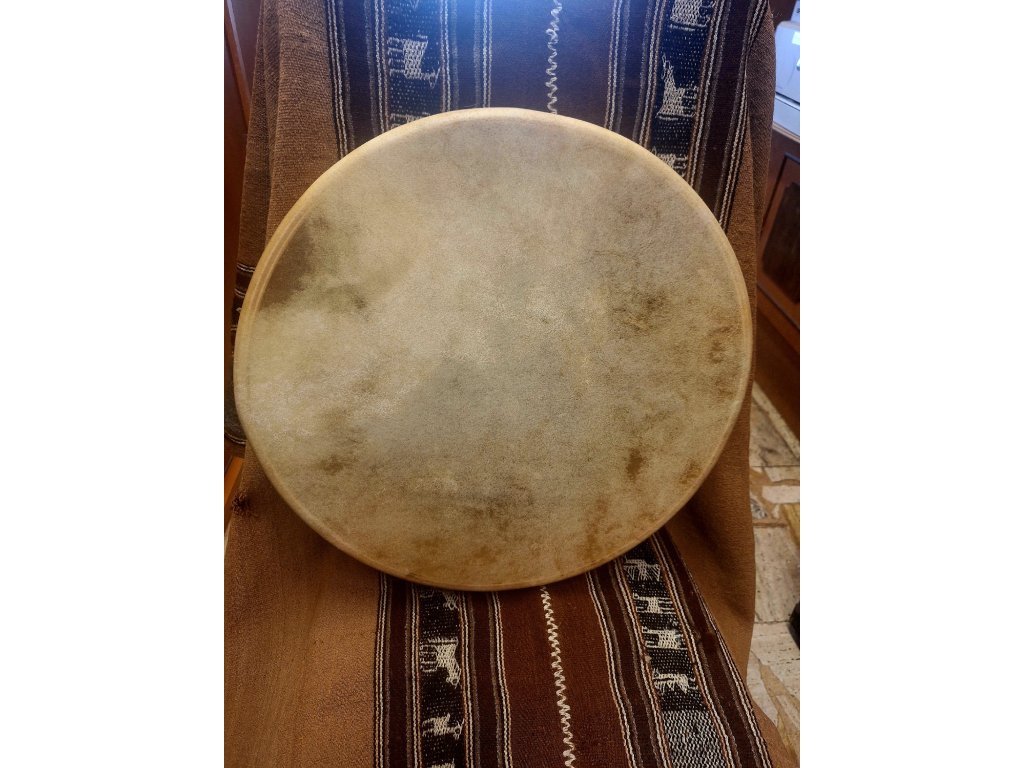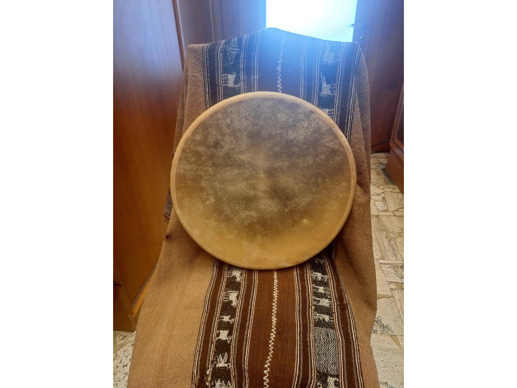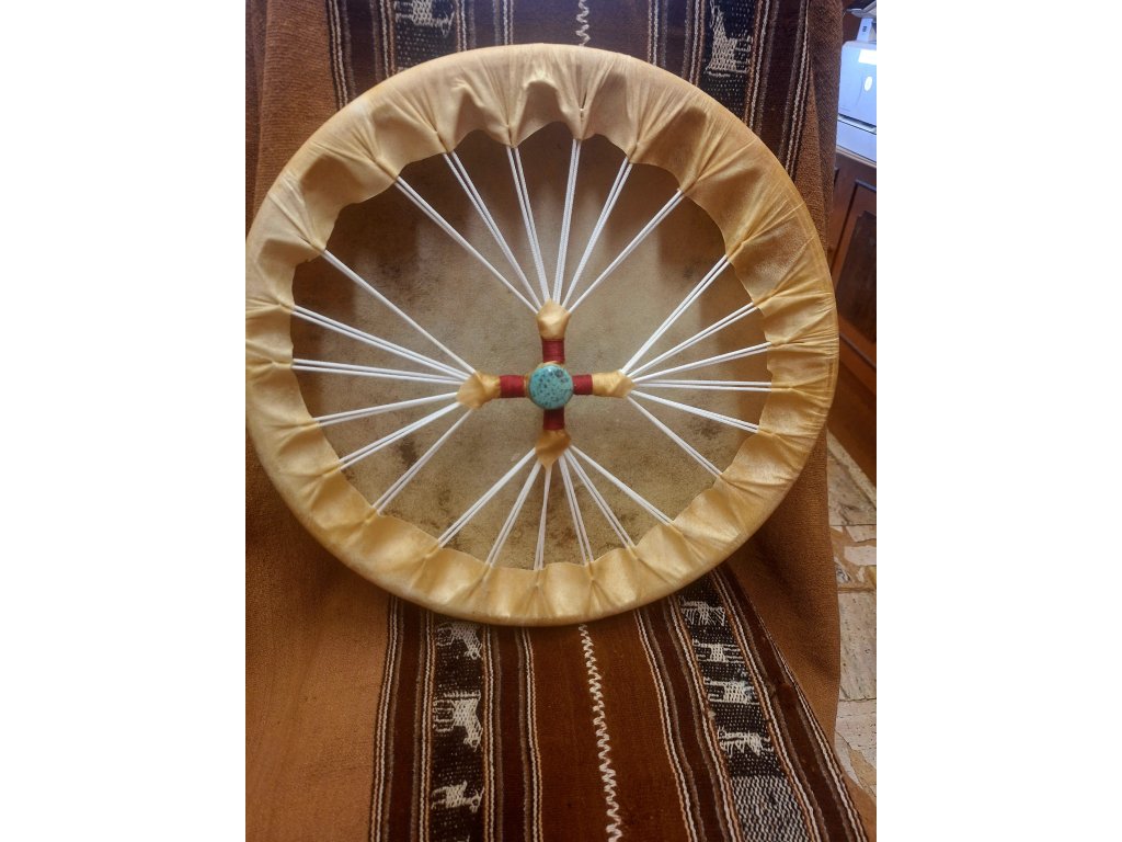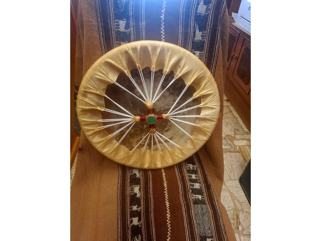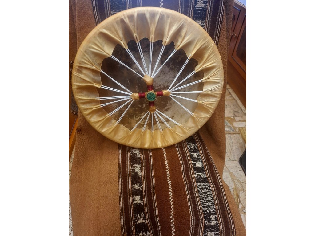 Šamanský bubon, rčne vyrobený z kozej kože. Priemer 40 cm. Viazaný rovnakou kožou. Uprostred viazania je umiestnený chryzocoll-peruánsky tyrkys. Viazanie symbolizuje 4 svetové strany, 4 základné elementy, tieto symboly sú v šamanizme veľmi dôležité.